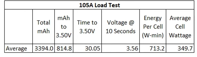 I ran a 105-amp load test to see how the battery performs under high stress. Voltage dropped quickly, stabilizing briefly around 3.56V per cell, and the average energy per cell was 73.2 Watt-minutes. The pack delivered an average of 3394mAh, short of the advertised 4000mAh capacity. We know the useable capacity is always lower then the capacity on the battery label. The pack reached over 60°C resulting in the test being terminated. I’d like to terminate the test once the pack hits 58C but this one quickly exceeded this amount.