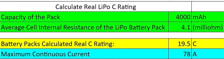 I measured the internal resistance of two HRB packs during the initial charge cycle. Both averaged 4.1 milliohms per cell. Using the RCexplained Patreon spreadsheet, this calculates to a real C rating of 19.5C, far below the advertised 60C. The corresponding maximum continuous current for this pack is about 78 amps, which is significantly lower than what the label suggests.