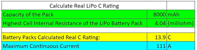 Using the measured resistance, the pack’s true continuous C rating comes out to roughly 13.9C. This equals a maximum safe continuous current of about 111 amps—far below the advertised 100C rating. Exceeding this would risk overheating and reduce battery lifespan.